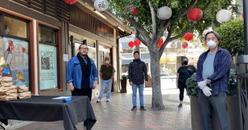 Socially distancing but helping out, small business owners (from left) Hiroo Nagahara (Bao Hiroo), Brian Kito (Fugetsu-Do) James Choi (Café…