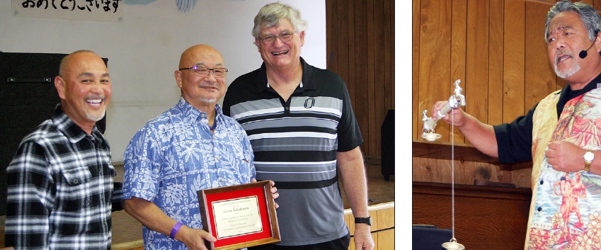 Left: The Fred Ikeguchi Community Service Award, named for a longtime volunteer, was presented to Gene Takahashi (center) by 2nd Vice President Ole Nervik (right) and Dr. Craig Takeshita (left). Right: Mark Kiyabu from Honolulu performed “magic with aloha.”
