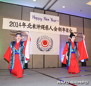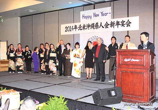 日系諸団体からの来賓が祝辞を述べた。南加日系商工会議所会頭の青木義男さんは、沖縄の新年会を毎年楽しみにしているといい「若い人のエナジーが満ち溢れている」と称賛。「そのエナジーを南加日商などが進める日系社会への奉仕活動にも費やしてほしい」と話し、國吉会長と役員の活躍を確信し、会のさらなる発展を願った。