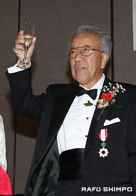 勲章を胸に乾杯する中村さん デッカーさんはあいにく、式には参加できなかったが、南加日米協会のテリー・ハラさんが代理で出席し、ハワード・ミヨシさんがデッカーさんの略歴を紹介した。デッカーさんは大学卒業後、米海軍の任務で駐日したことから親日家となった。退役後は、金融界で活躍するかたわら、日系諸団体で要職を歴任。全米日系人博物館の他、理事17年間、理事長を2年間務めた南加日米協会では、日本の財界から招いた多くの講演会を催し、小渕恵三総理のロサンゼルス訪問も実現させるなど、日米関係の促進に寄与した。