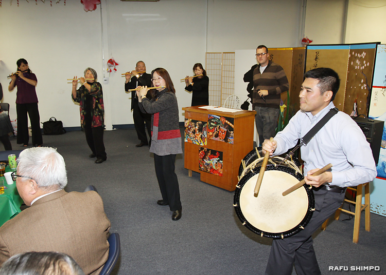 乾杯の音頭を囃子保存会メンバーの山村俊夫さんがとり、昼食をともにした。エンターテインメントはもちろん、これしかない。「ドーン」と、轟く太鼓を合図に演奏開始。ねぶた囃子のメンバーが、笛と太鼓、鉦の音を響かせると、釣られた参加者はハネトになったように「ラッセラー」と叫び、本番さながらの熱演で盛り上がった。会が最高潮に達したところで、三本締めで閉会した。